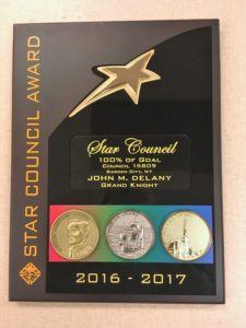 John Delany, PGK holds the Star Council Plaque 2016-2017 earned during his tenure. also pictured L-R are our District Deputy James Corrigan, DGK John Mastanduono, GK Robert Matarazzo, and PGK John Russo